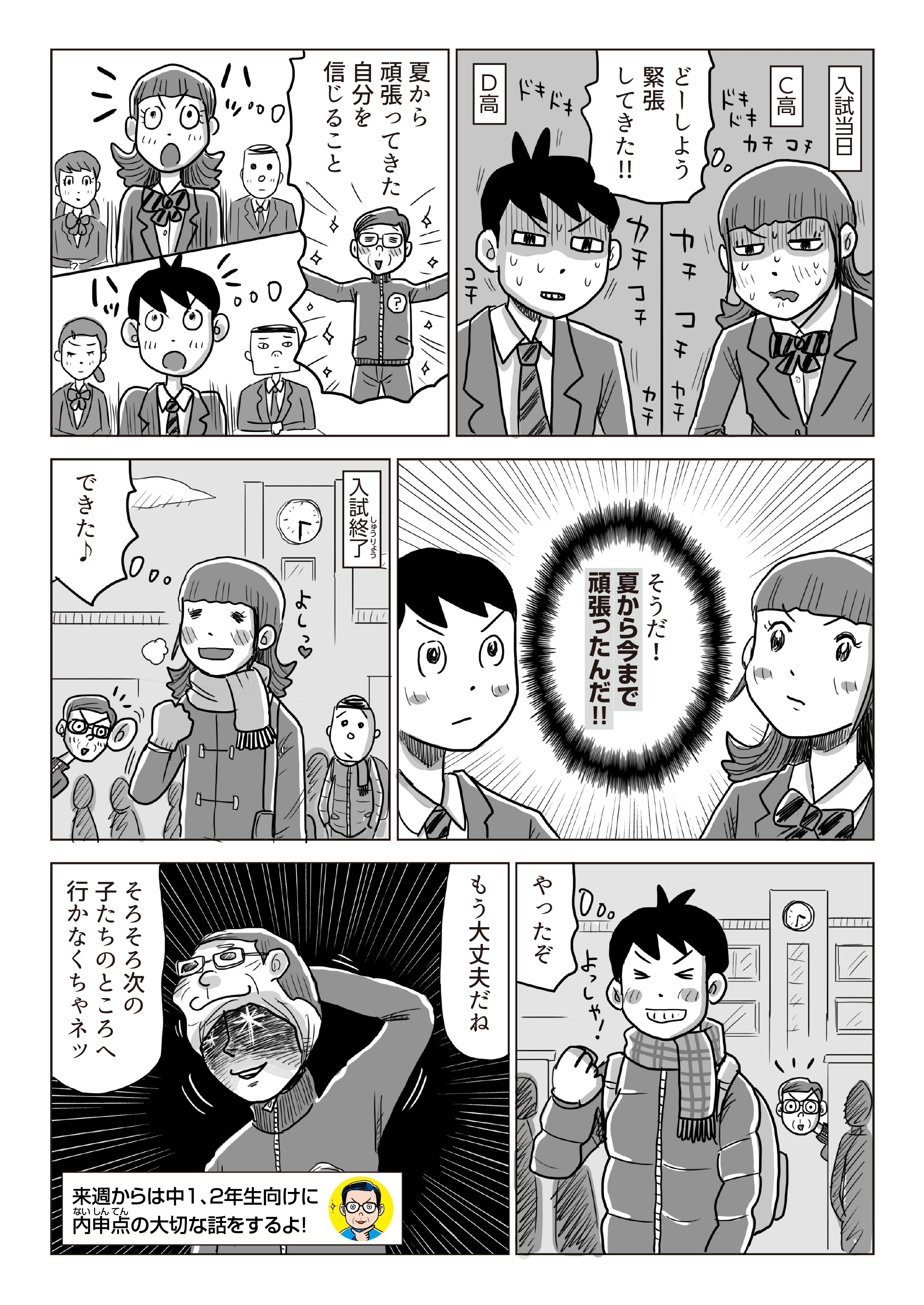 二人の自信に満ちた顔ステキだった!! 自分を信じて頑張ってきたからだネ。ますます「いち高」に向けて頑張るみんなを応援したくなっちゃったヨ~。で、さっそく合格したゼミの先輩から「やる気がでないときの工夫」を教えてもらったヨ。やる気が出ないときは先輩のマネをしてみよう!