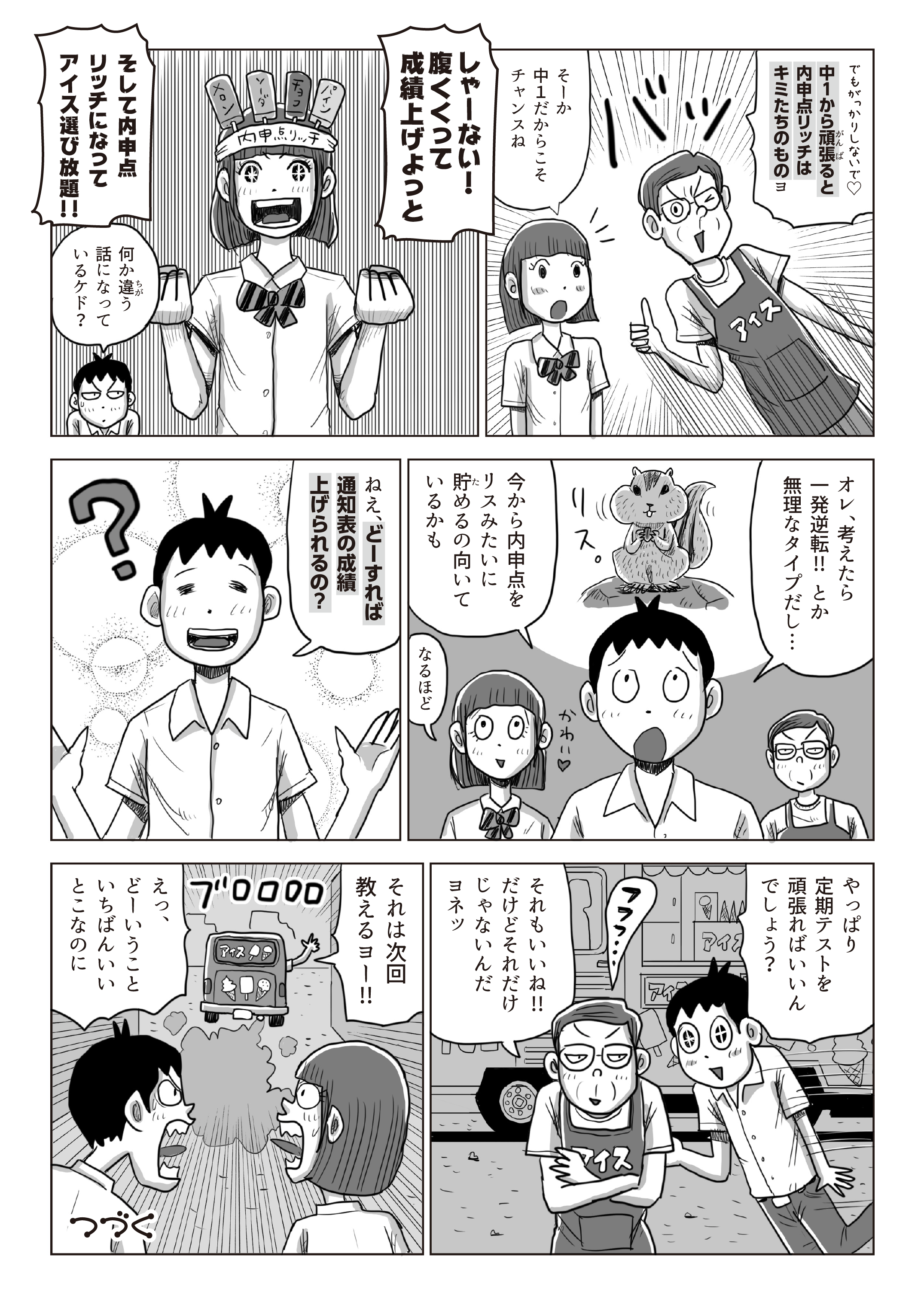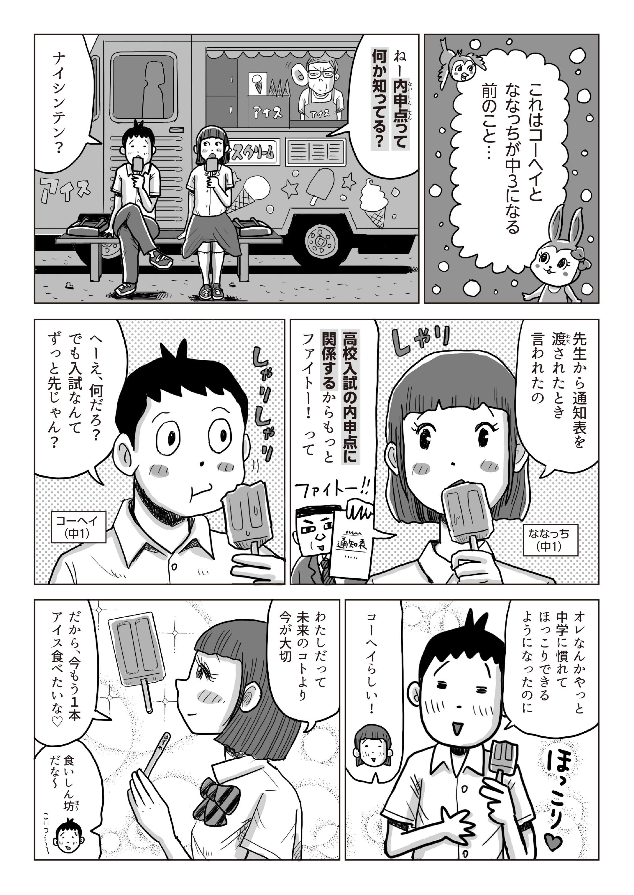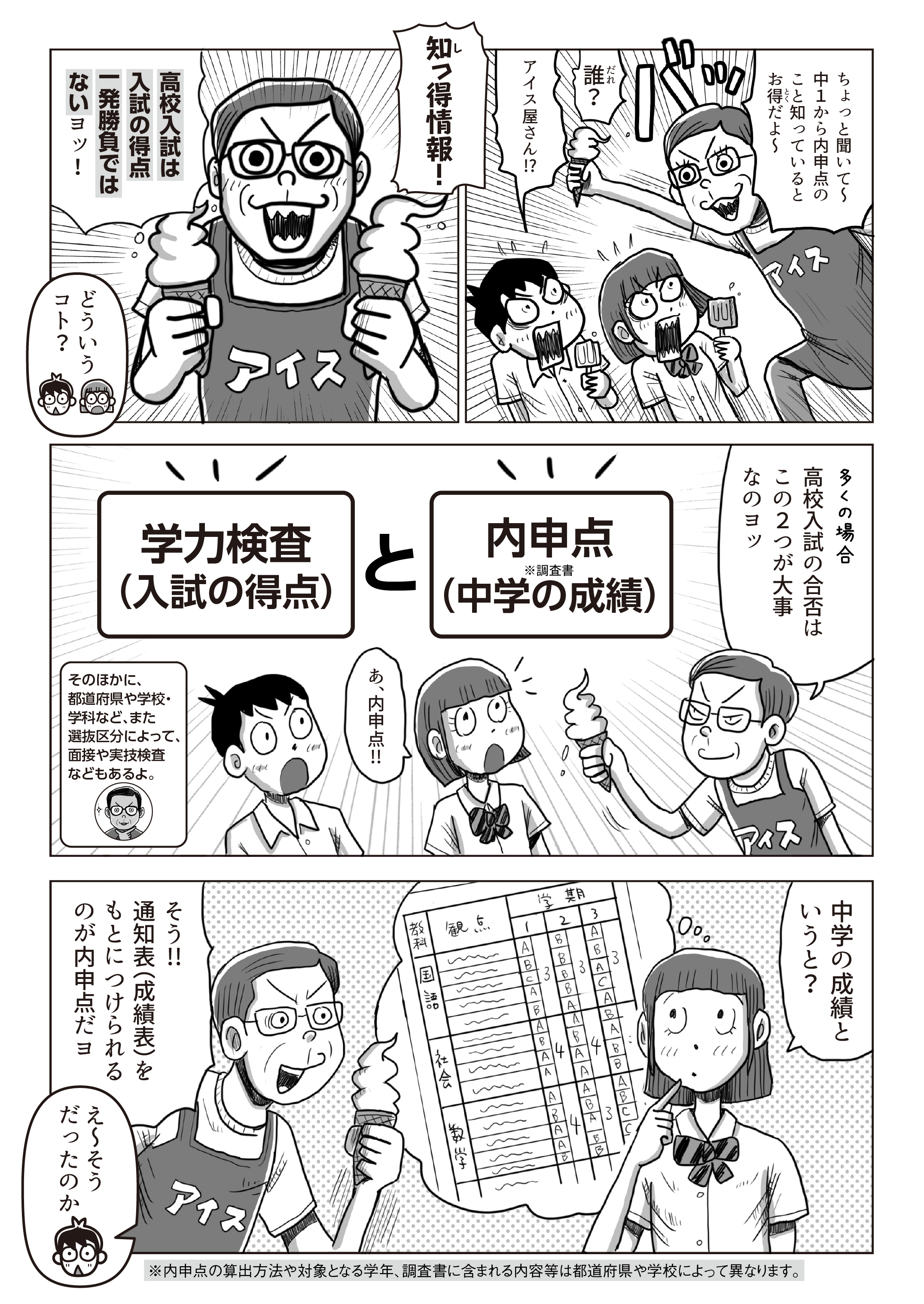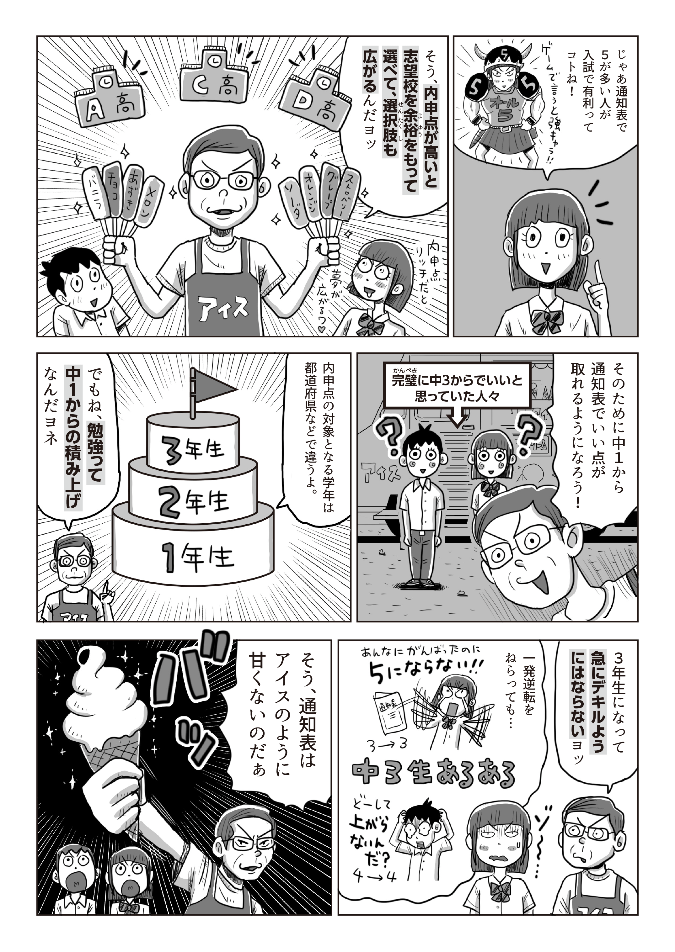 コーヘイもななっちも、中3になる前はこんなだったんだネ。この内申点リッチ作戦は1・2年生だからこそできる入試対策!!3年生になったら「やっててよかった\(^o^)/」と思うこと間違いなしだヨ。今、キミが気になっている高校に合格した先輩が、中1・2のときにどのくらいの成績をとっていたのかチェックしてみてヨ~!