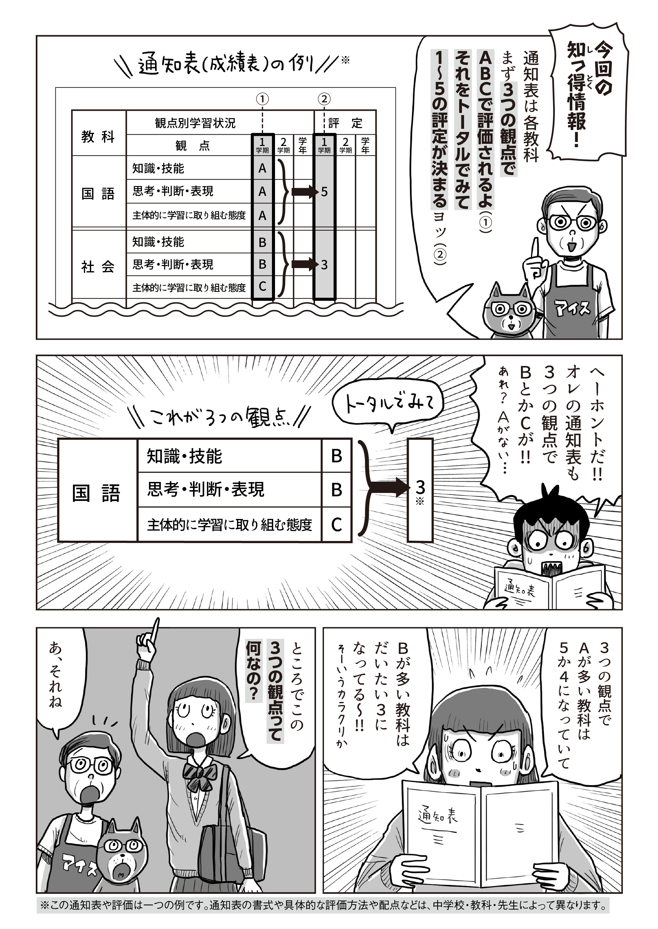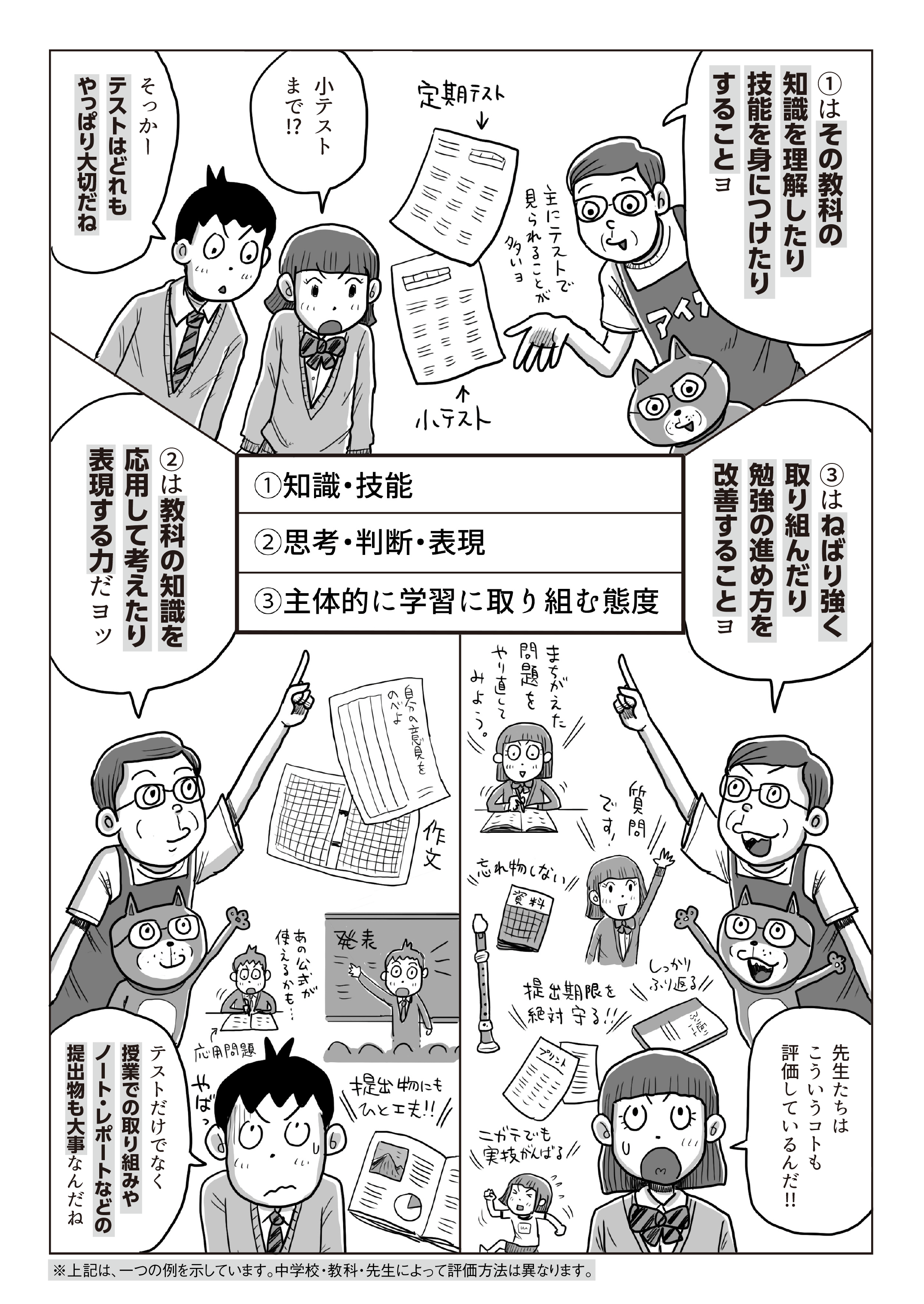 通知表の評価の仕組みわかったかな? 大事なことは「定期テストはもちろん、小テストや授業での取り組み、提出物などの日々の頑張りが成績に反映される」ということだヨ! 通知表の仕組みがもっと詳しくわかるセミナーを紹介するネ。マンガは最終回だけど、これからも「高校入試情報サイト」に定期的に見にきてネ! これからずっと合格まで役立つ情報をお届けするヨ!